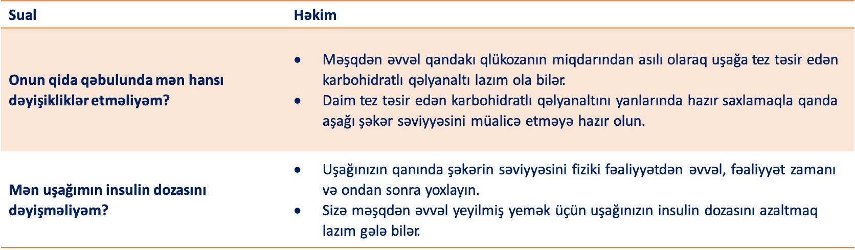 Uşağınızın müalicə planına hər hansı dəyişikliklər etməzdən əvvəl həkim ilə danışın. Həkiminiz uşağınızın nə yeməli olduğunu sizə deyəcək və onun fiziki fəaliyyətinə əsaslanaraq insulin dozasını necə nizamlamalı olduğunuzu öyrədəcək.